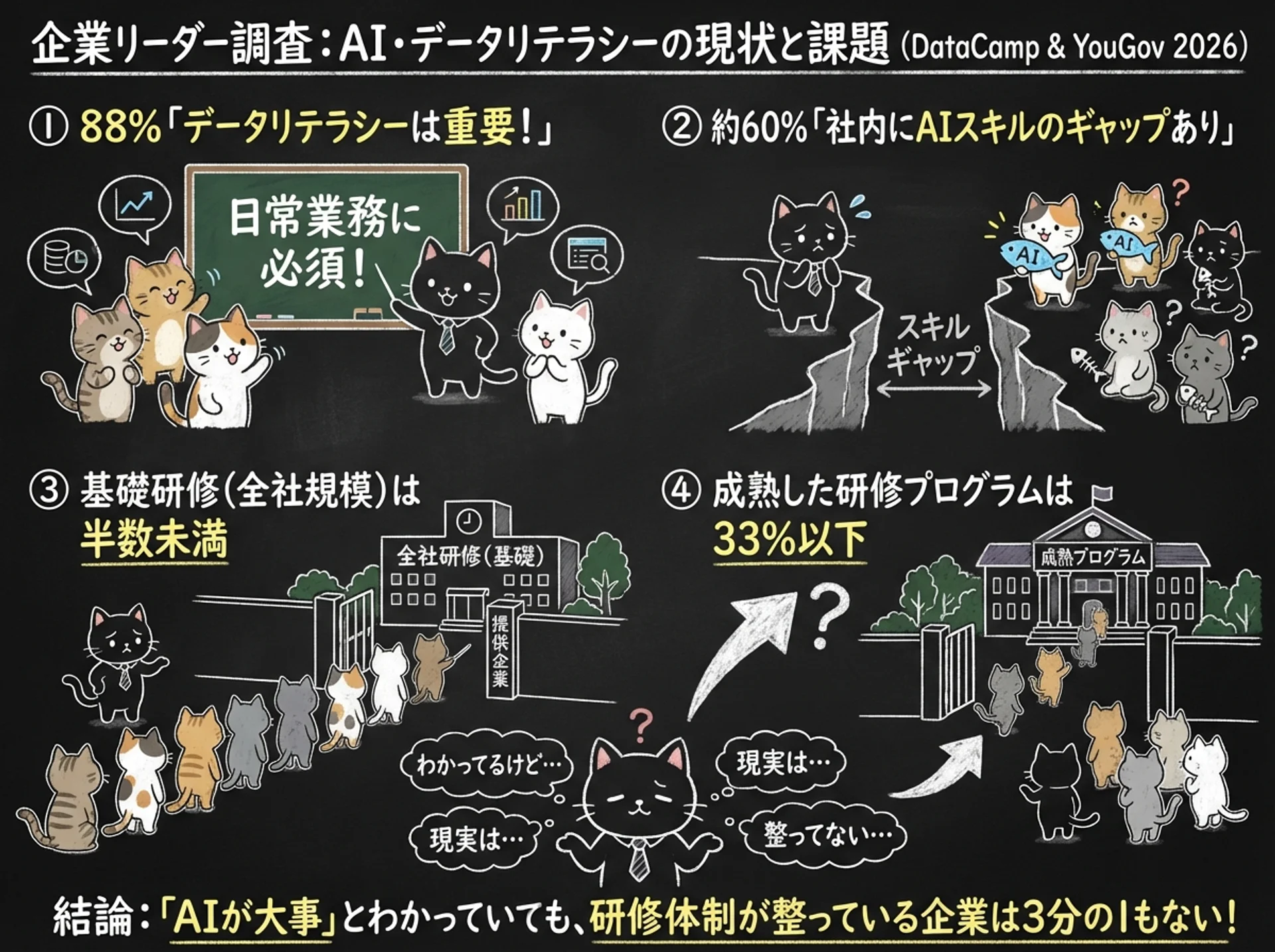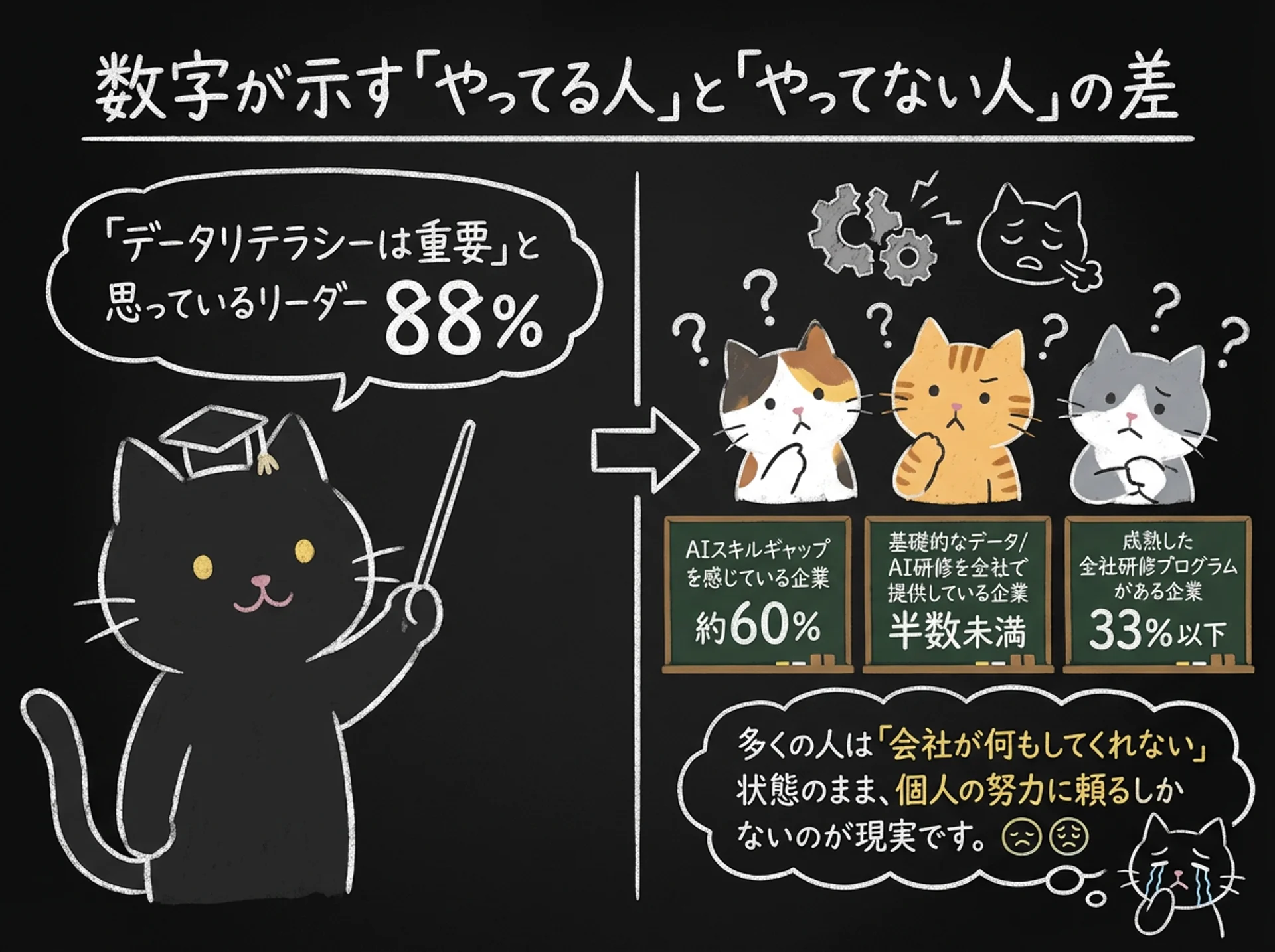 - 本質: 企業の9割近くが「AIスキルは重要」と認識。でも教育体制は追いついていない