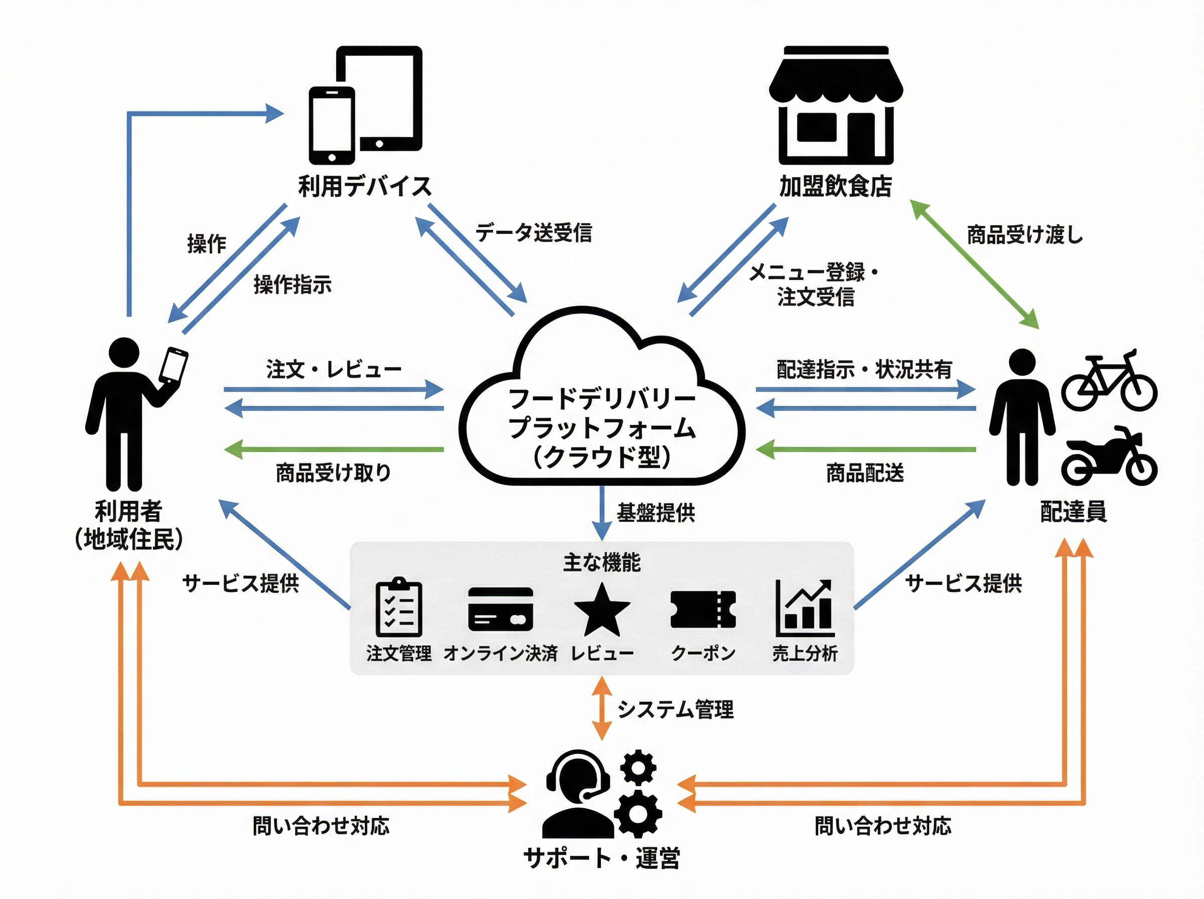 ビジネスモデルの概念図をピクトグラムスタイルで作成するプロンプトです。フラットで...