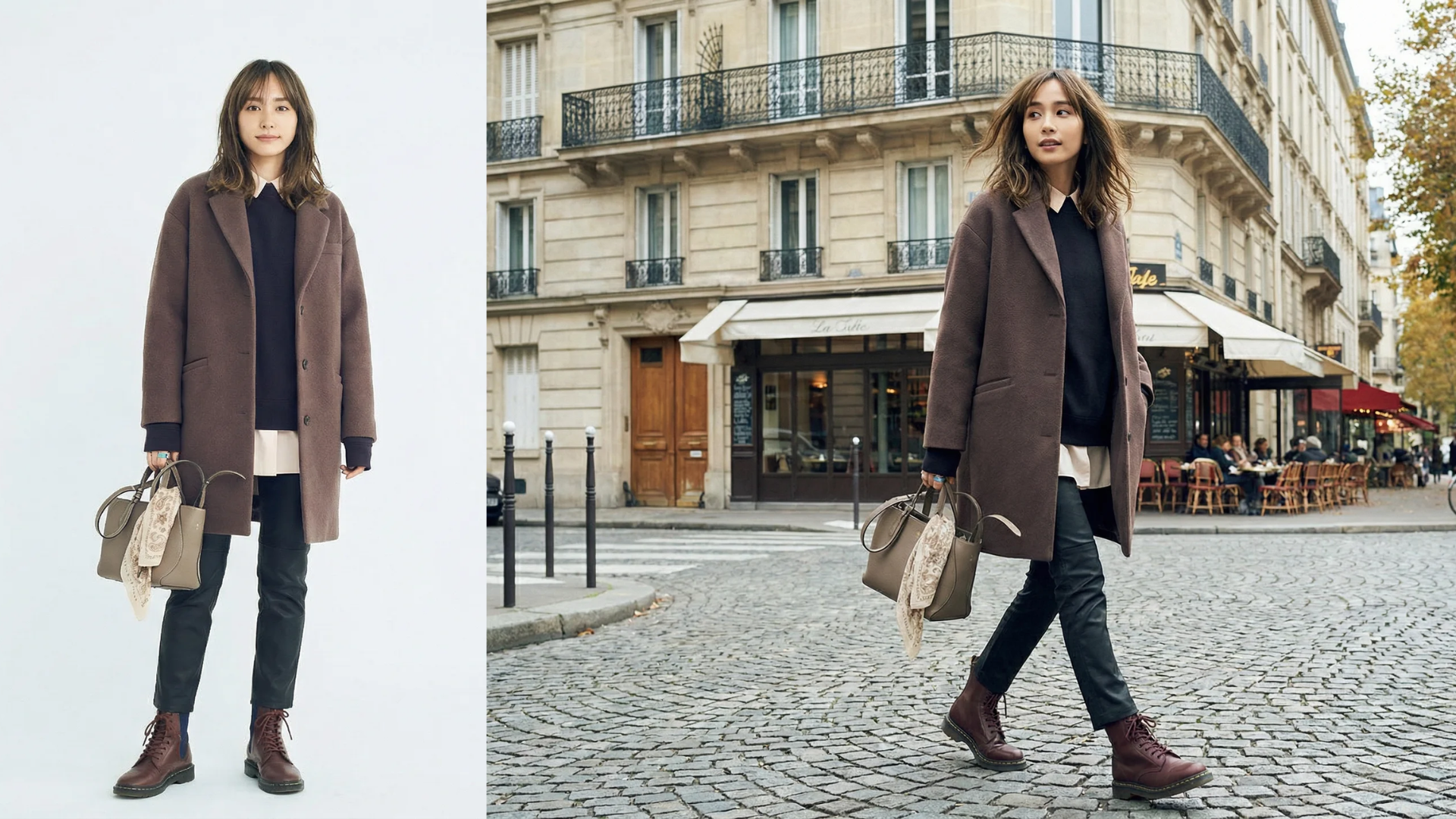 パリの石畳を舞台にしたストリートスナップ風の写真を生成するプロンプトです。自然な...